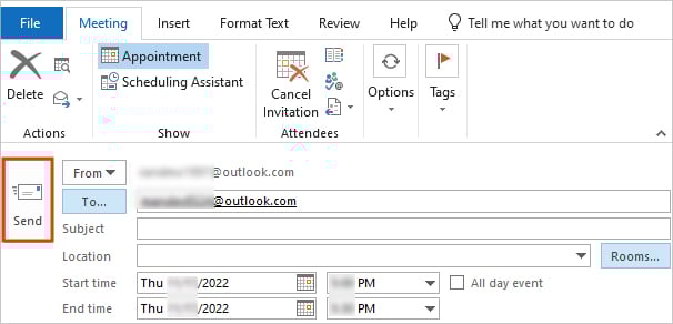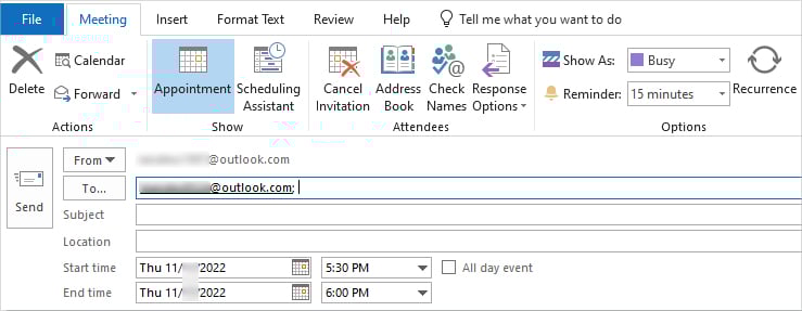 Digite os e-mails ao lado do campo Para. Além disso, especifique o horário de início, término e outros detalhes, como assunto e local.
