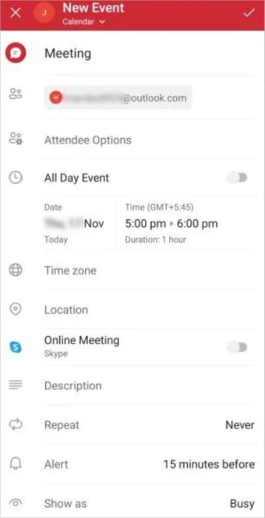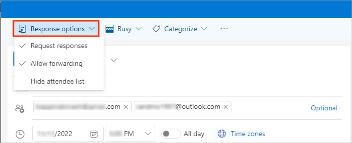 Adicionar um título: forneça um título apropriado para sua reunião.Data: selecione a data e a hora para iniciar a reunião. Ative o botão Dia inteiro se quiser conduzir a reunião por um dia inteiro (24 horas).Não repetir: selecione uma opção dentro dele se quiser que o reunião para ocorrer diariamente, semanalmente, mensalmente ou anualmente.Alarme: Escolha receber notificações antes do início da reunião no Outlook.Além disso, clique no botão Mais opções para revelar opções adicionais.Insira o endereço de e-mail das pessoas que você deseja convidar para o seu calendário do Outlook no espaço reservado Convidar participantes. Clique em Opcional ao lado dele e adicione pessoas que podem participar da reunião, se desejarem, mas não obrigatório. Selecione Opções de resposta na barra superior.