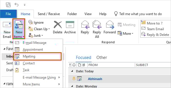 Na guia Início, clique em Novos itens e selecione Reunião. Ou clique no botão Nova reunião.
