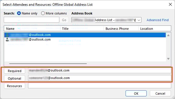 Clique no botão Para. Em seguida, adicione o endereço de e-mail das pessoas que deseja convidar de seus contatos/Catálogo de endereços do Outlook. Em seguida, preencha os seguintes campos.