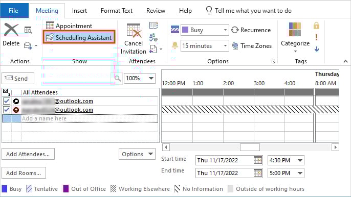 Obrigatório: Endereço de e-mail da pessoa para quem a participação na reunião é obrigatória.Opcional: Endereço de e-mail da pessoa que pode aceitar o convite, mas não necessariamente comparecer. Insira os outros detalhes (assunto, local, horário de início e término da reunião) de acordo com seus requisitos. Clique em Assistente de Agendamento. Em seguida, você pode visualizar uma lista de todos os participantes e verificar se eles estão disponíveis no período de tempo especificado. Este recurso pode não aparecer se você não estiver usando o Office 365 ou conectado ao Microsoft Exchange.