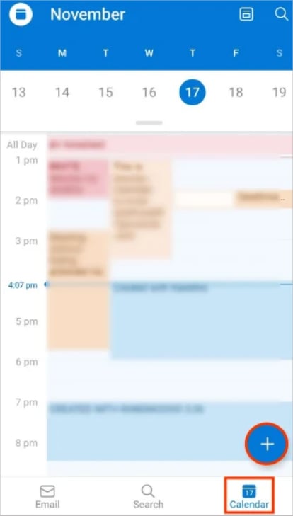 Abra o aplicativo Outlook e toque em Calendário na barra inferior. Toque no ícone de adição para criar um novo evento de calendário.