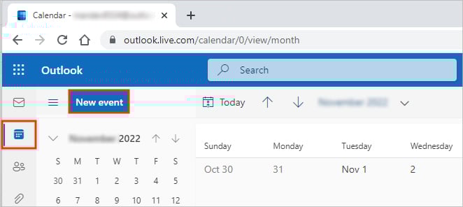 Abra um navegador e faça login em sua conta do Outlook.Selecione o ícone Calendário no canto superior esquerdo.Clique no botão Novo evento.