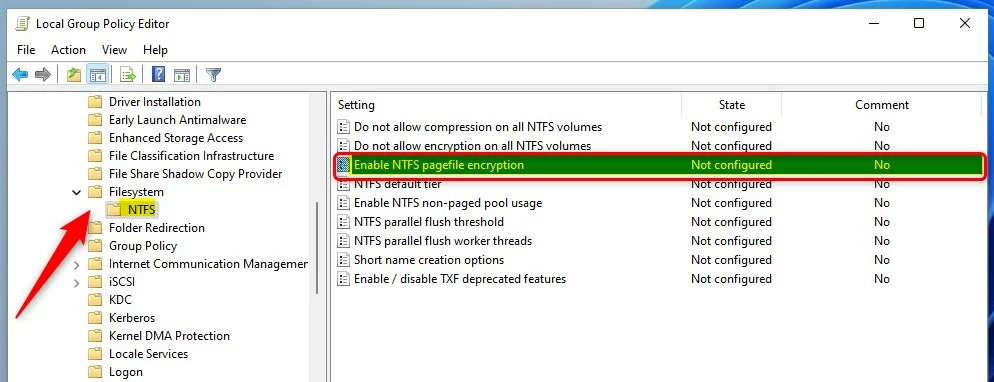 No NTFS painel de detalhes à direita, localize e clique duas vezes na configuração que diz “Ativar criptografia de arquivo de paginação NTFS “.
