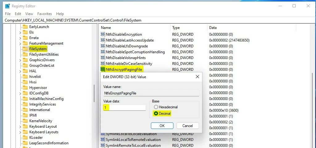 No painel direito da chave FileSystem, clique duas vezes em Nome do valor NtfsEncryptPagingFile conforme destacado abaixo.