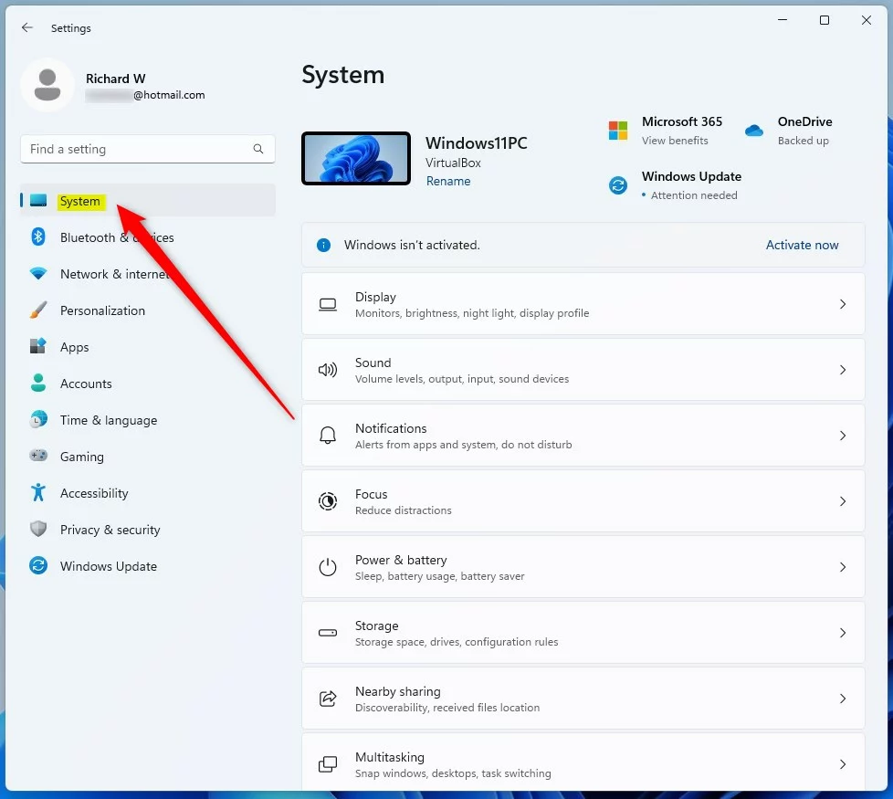 No aplicativo de configurações, clique no botão Sistema à esquerda como destacado abaixo.