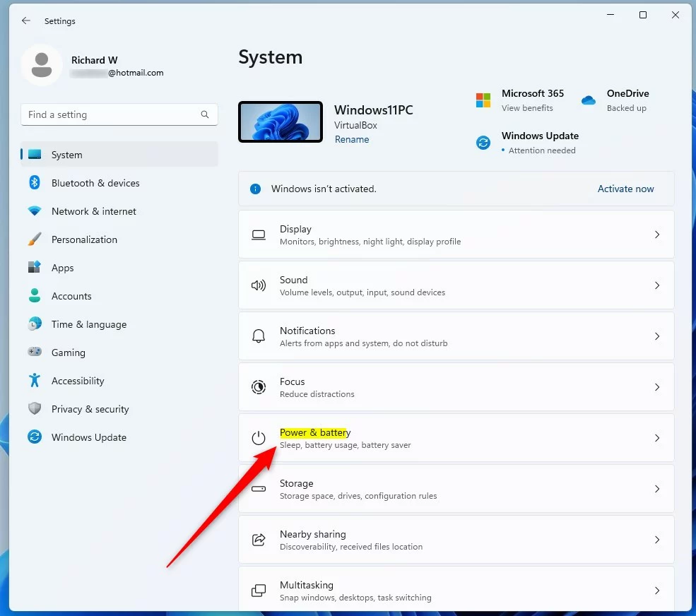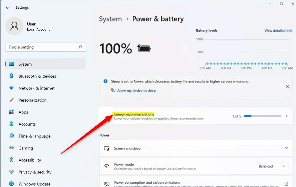 No painel de configurações Sistema-> Energia e bateria, clique no ladrilho Recomendações de energia para expandir.