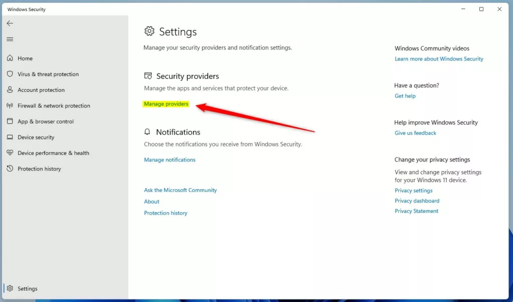 Na página Configurações de segurança do Windows, em Provedores de segurança, clique no link Gerenciar provedores.