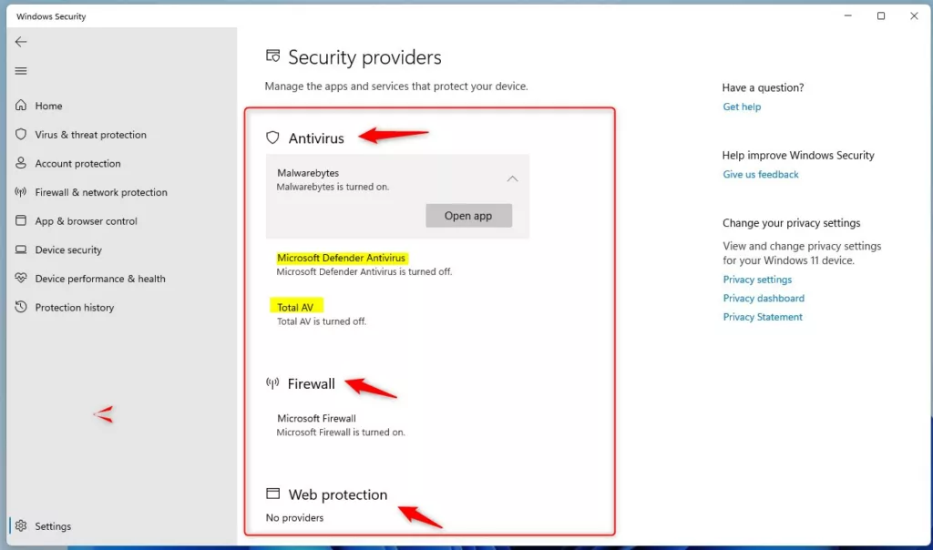 Conforme descrito acima , a seção Provedores de segurança nos aplicativos de segurança do Windows lista todos os antivírus, firewall e proteção da Web provedores de segurança que estão sendo executados em seu dispositivo e registrados com Segurança do Windows.