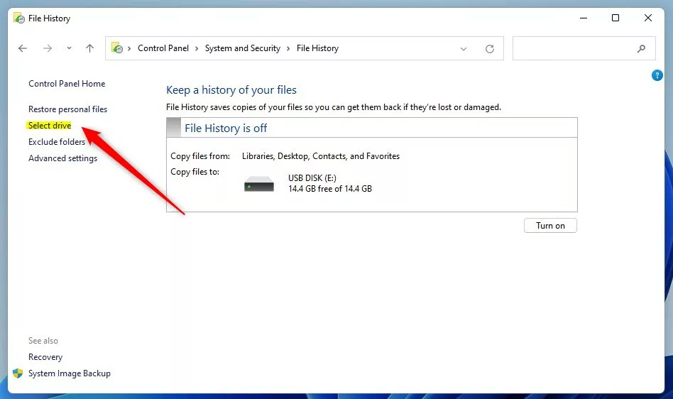 painel de controle do histórico de arquivos do Windows 11 seleciona unidades