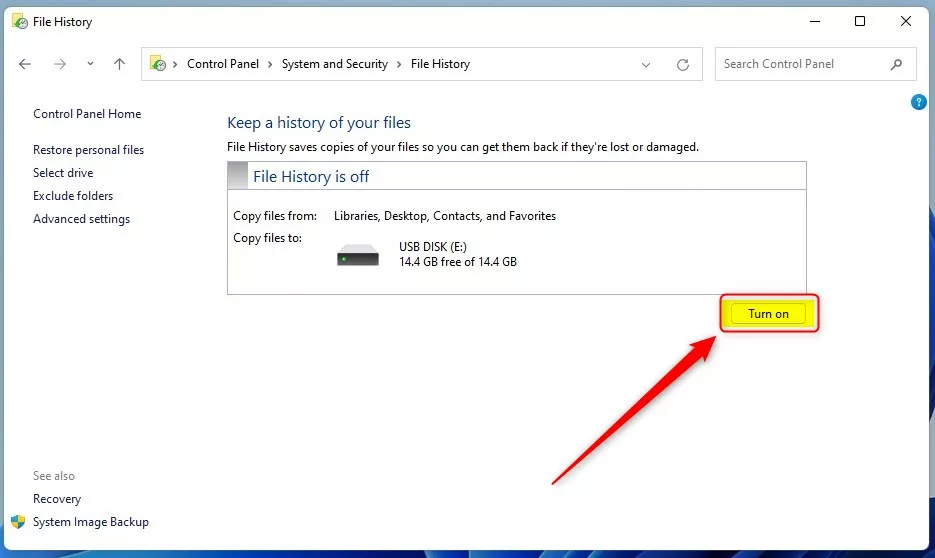 No aplicativo Painel de controle, navegue até o caminho Sistema e segurança-> Arquivo Histórico.
