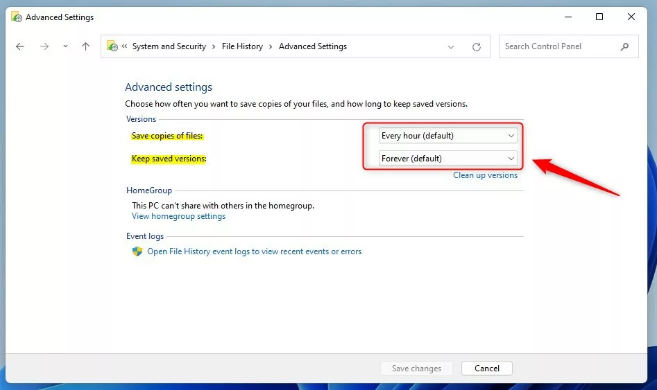 Na página Painel de controle-> Sistema e segurança-> Histórico de arquivos-> Configurações avançadas, você pode escolher com que frequência deseja fazer backup das alterações de arquivo e pasta e por quanto tempo mantê-las.
