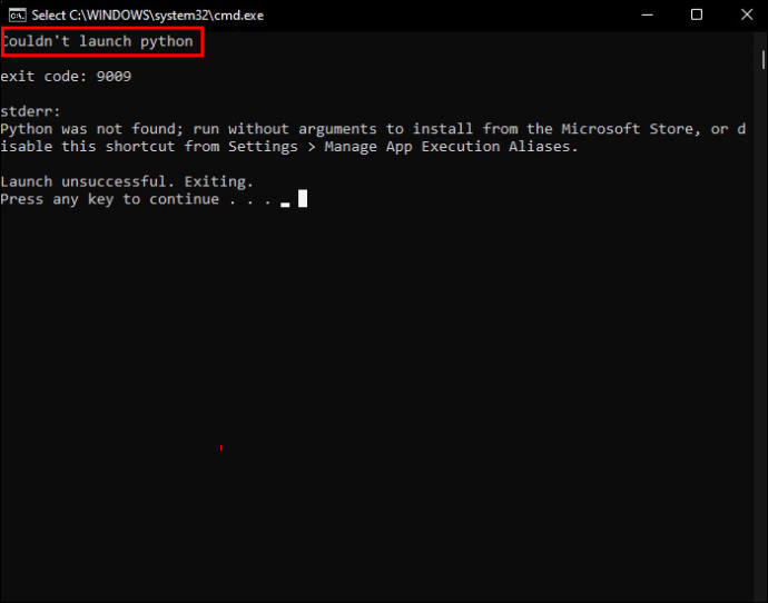 A janela do prompt de comando será aberta e exibirá um erro”Não foi possível iniciar o python”. Deixe a janela do prompt de comando aberta.