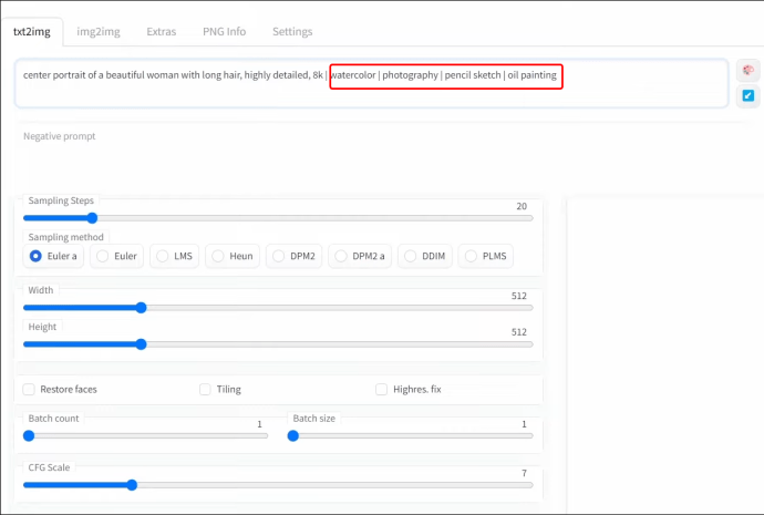 Digite o prompt no campo prompt e pressione espaço. Insira um caractere de barra vertical – “|”– e adicione outro espaço. Insira as diferentes versões de estilo que deseja usar, por exemplo,”pintura a óleo”ou”aquarela”e use a barra vertical para separar cada um.