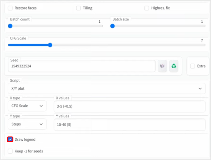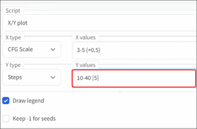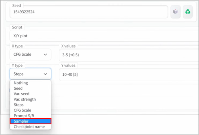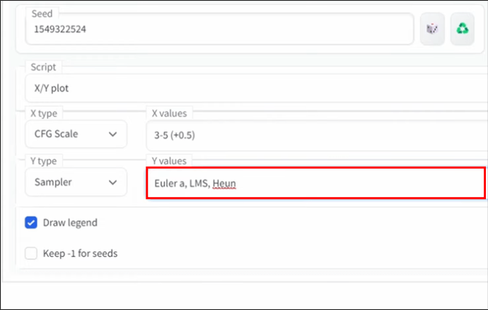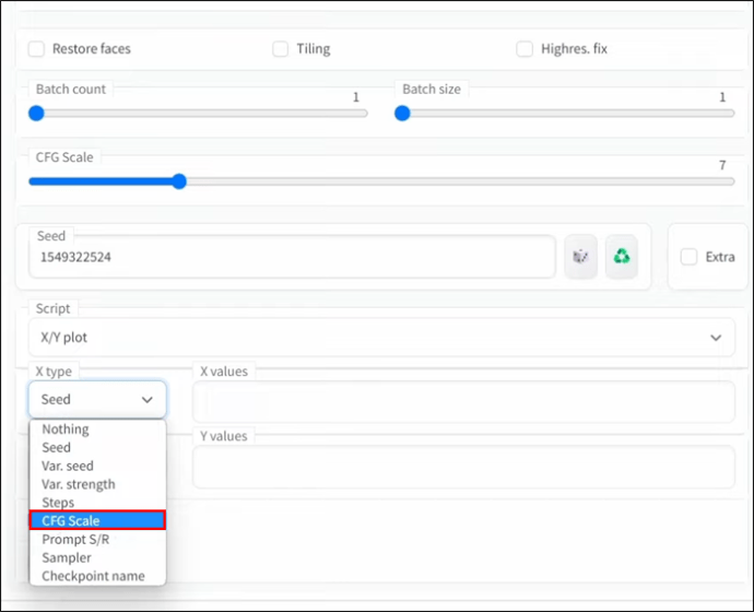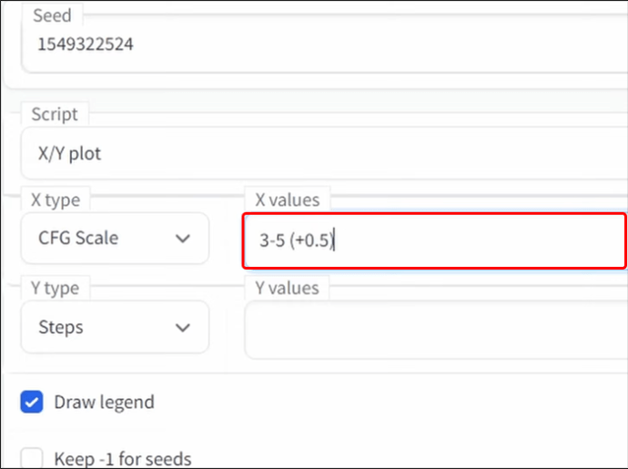 No campo de entrada”X values”, considere definir a escala CFG para”3–5″. Isso gerará versões de números inteiros da sua imagem. Se você deseja produzir meios números, digite: “3-5 (+ 0,5) usando colchetes.