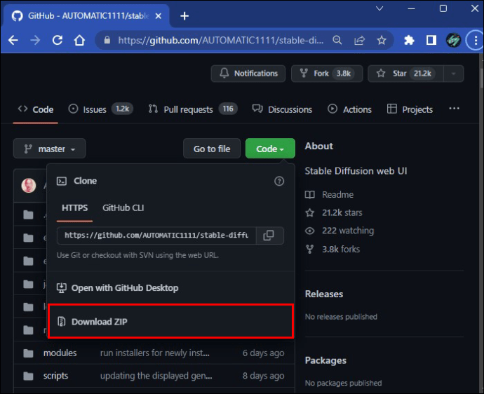 Agora visite o GitHub para baixar o Stable Diffusion interface do usuário da web. Clique no menu suspenso”Código”e selecione”Baixar ZIP”.