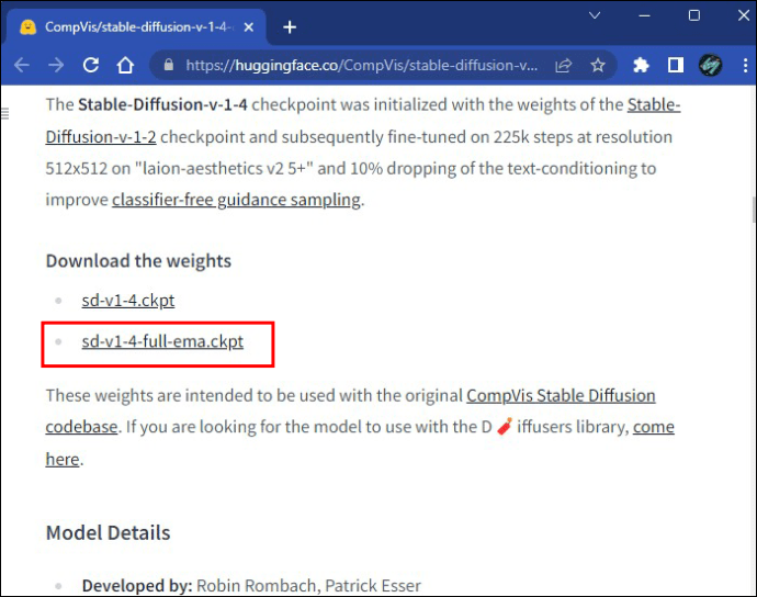 Vá para huggingface.co para baixar a versão SD mais recente. Nesta página da web, você precisará criar uma conta gratuita. Role para baixo para escolher a versão “…full EMA…” para uma versão abrangente. Este é um arquivo grande e pode demorar um pouco para terminar o download.