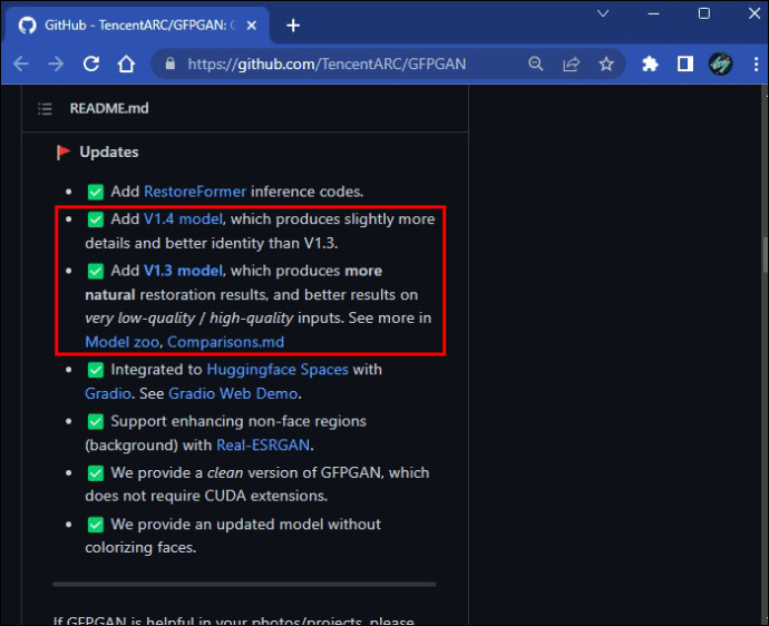 Visite Página da Web”GFPGAN”do GitHub para baixar os arquivos Gen para o recurso”Restauração facial”. Role para baixo até a seção”Atualizações”com caixas verdes marcadas. Baixe o”modelo V1.3″para obter resultados mais naturais; também, baixe o”modelo V1.4″para obter mais detalhes.