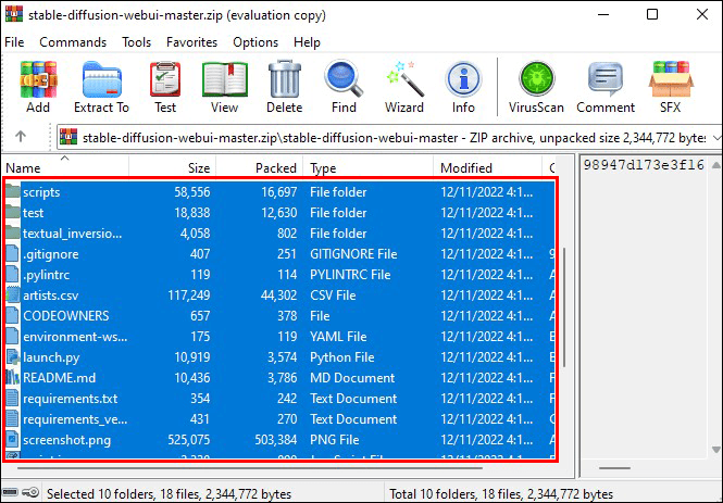 Vá para o arquivo zip”Stable Diffusion Web UI Master”, clique duas vezes nele e, em seguida, clique duas vezes na versão da pasta. Selecione todos os arquivos dentro dessa pasta e mova-os para a pasta local SD que você criou anteriormente na pasta”Documentos”. Certifique-se de que todos os arquivos estejam visíveis lá.