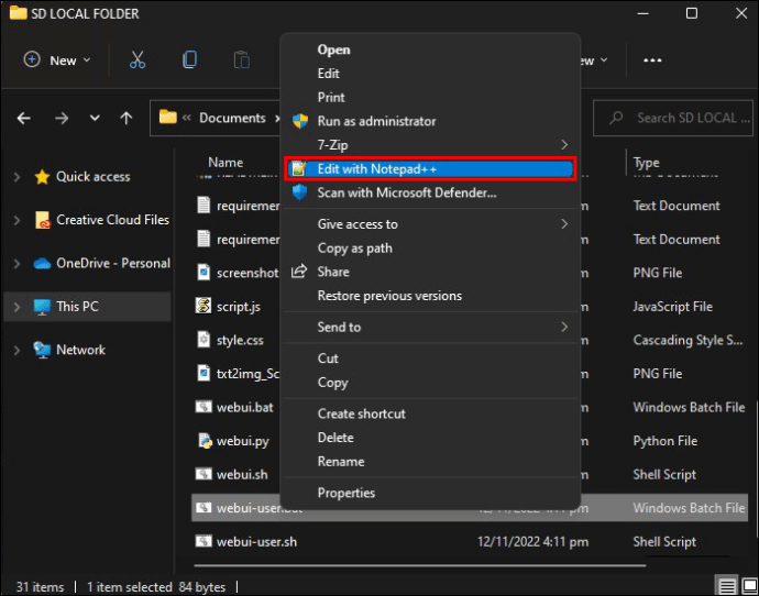 Clique com o botão direito do mouse no arquivo”webui-user.bat”, vá para”Mostrar mais opções,”em seguida, selecione”Editar com Notepad++.”