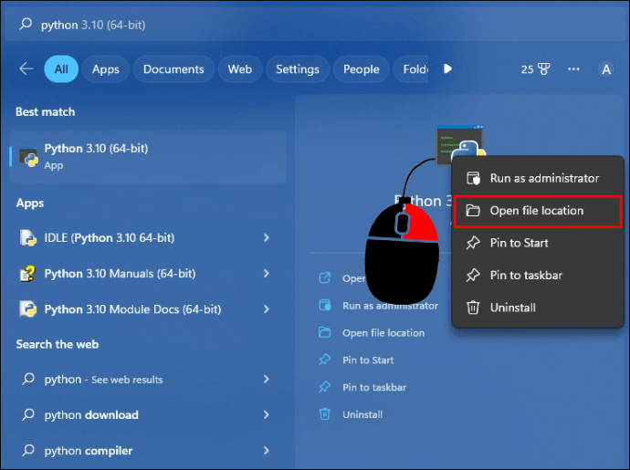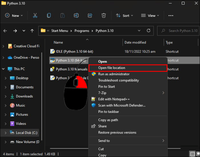 Clique com o botão direito do mouse no aplicativo Phyton e selecione”Abrir local do arquivo.”