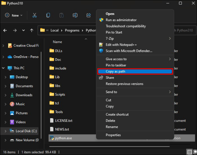 Clique com o botão direito do mouse no arquivo”phyton.exe”e selecione”Copiar como caminho.”O caminho será copiado para a área de transferência.
