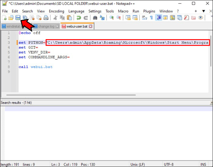 Volte para o Notepad++ e coloque o cursor ao lado da linha “set PHYTON=”para copiar o caminho. Clique em “Salvar.”