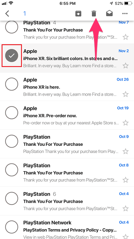 Toque em todos os “emails” que deseja remover e, em seguida, toque na “lixeira ícone” (excluir) na parte superior da tela para excluí-los.