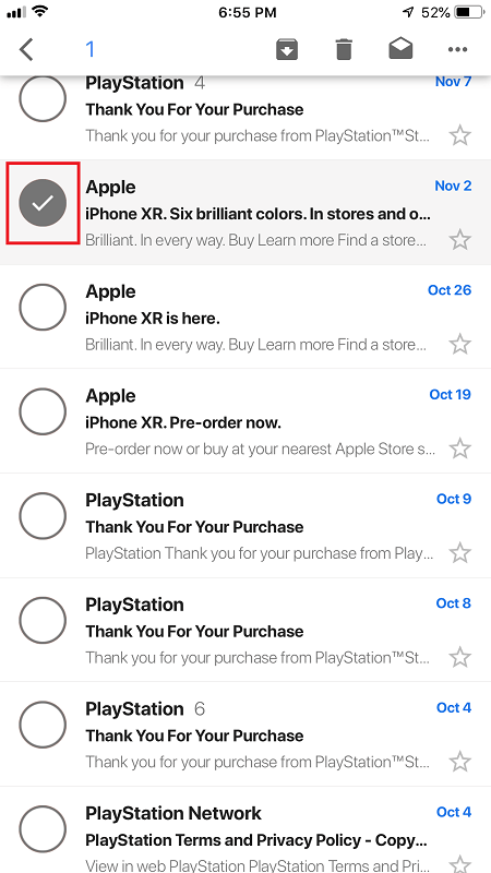 Toque em todos os “emails” que deseja remover e, em seguida, toque na “lixeira ícone” (excluir) na parte superior da tela para excluí-los.