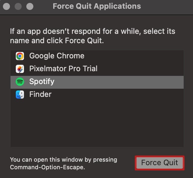 Use a tecla Command + Options + Esc para abrir a janela Forçar o encerramento de aplicativos.Na lista de aplicativos ativos, selecione aquele que deseja fechar à força.