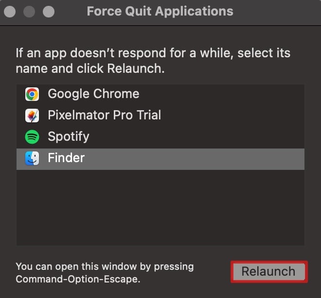 Clique no botão Opção Forçar encerramento. Confirme Forçar encerramento. Para atualizar o sistema, selecione Finder.