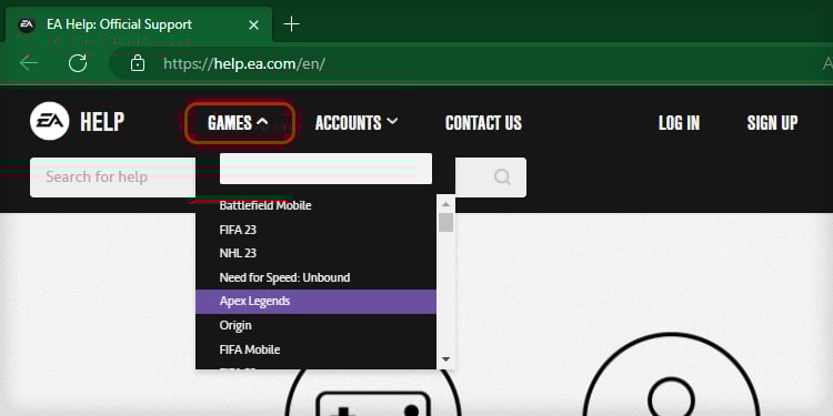Navegue até Página de ajuda da EA. Passe o mouse sobre a opção Jogos no topo da página.Clique em Apex Legends na lista.