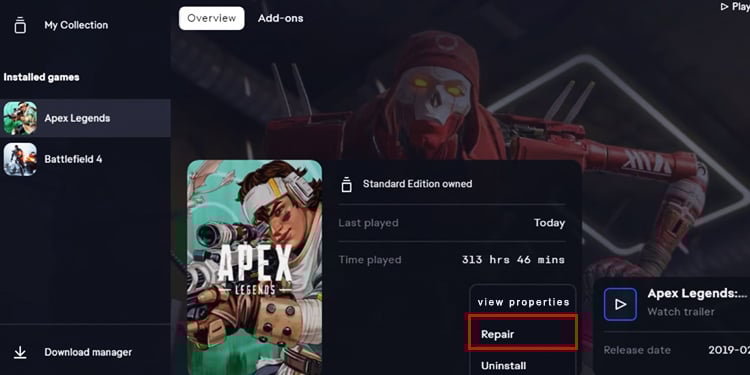 Abra o aplicativo EA e navegue até sua biblioteca de jogos. Clique no ícone Configurações de Apex. Escolha Reparar.