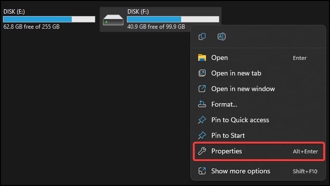 Pressione a tecla Windows + E para abrir o Explorador de arquivos Clique com o botão direito do mouse na unidade afetada e clique em Propriedades