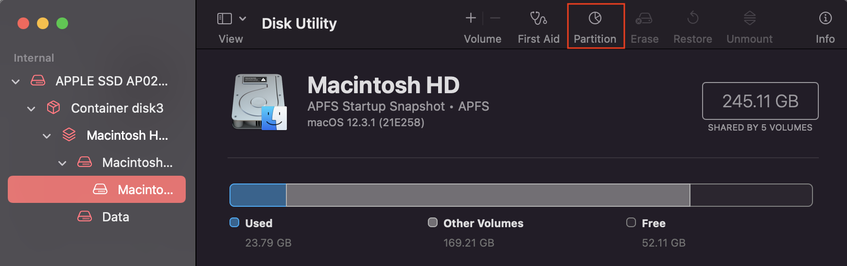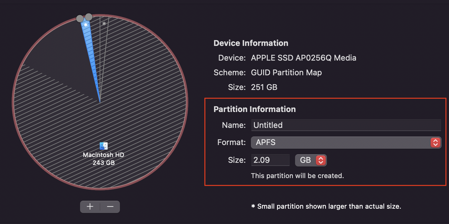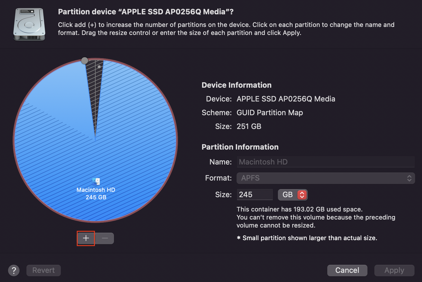 Pressione Command + Space para abrir o Spotlight. Pesquise e vá para Disco Utilitário. Selecione o disco rígido que deseja particionar na barra lateral esquerda. Em seguida, na barra de opções, selecione Partição. Clique no sinal ‘+’ abaixo do gráfico de pizza e escolha Adicionar Partição.