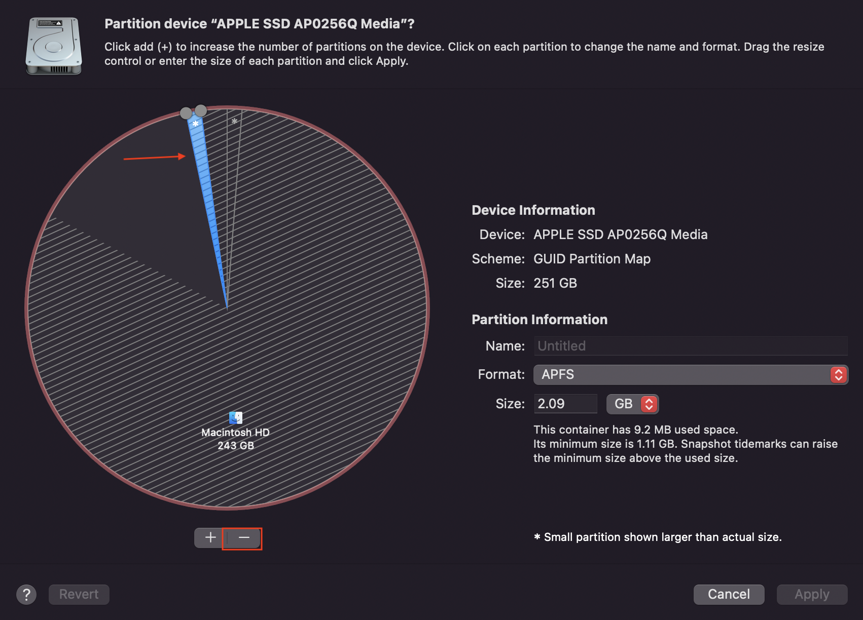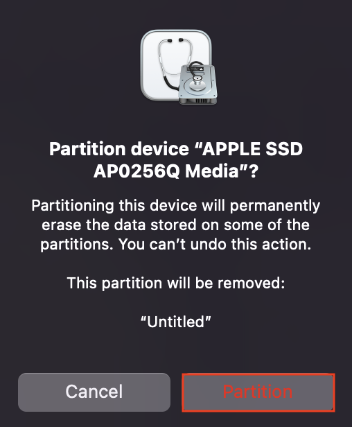 Anote a Partição Informações e escolha Aplicar. Quando a mensagem de prompt aparecer, clique em Partição.