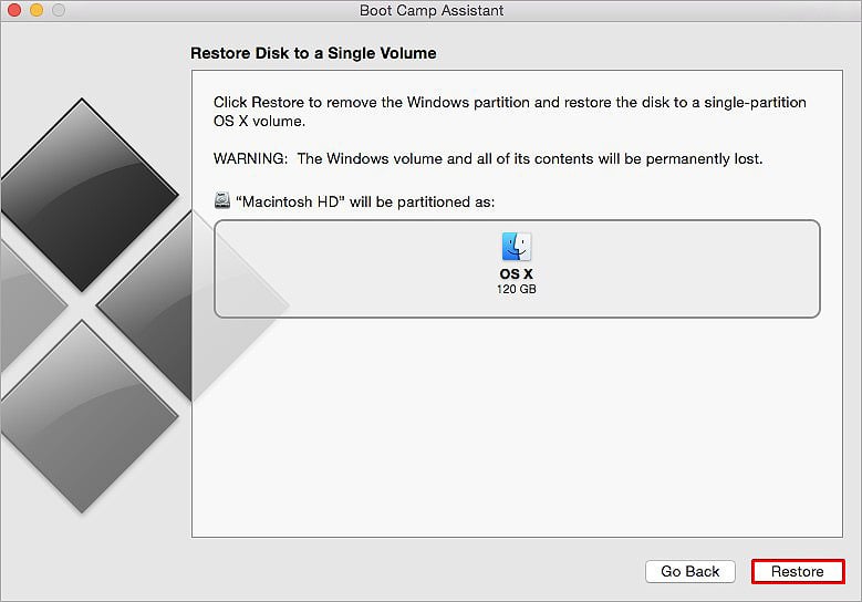 Pressione Comando + Espaço para abrir o Spotlight. Pesquise e vá para Assistente do Boot Camp. Clique em Continuar no painel Introdução. Em seguida, clique em Restaurar para excluir sua partição do Windows.
