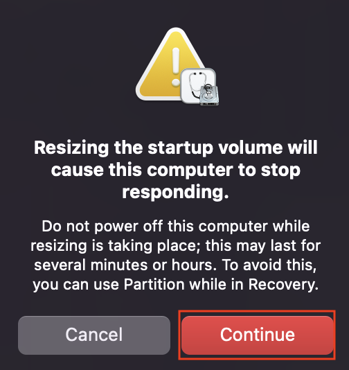 Em seguida, clique em Aplicar. Quando a mensagem de aviso aparecer, confirme sua decisão e escolha Particionar. Se você receber uma mensagem informando que o particionamento de seu disco rígido pode levar várias horas, clique em Continuar para execute a operação.