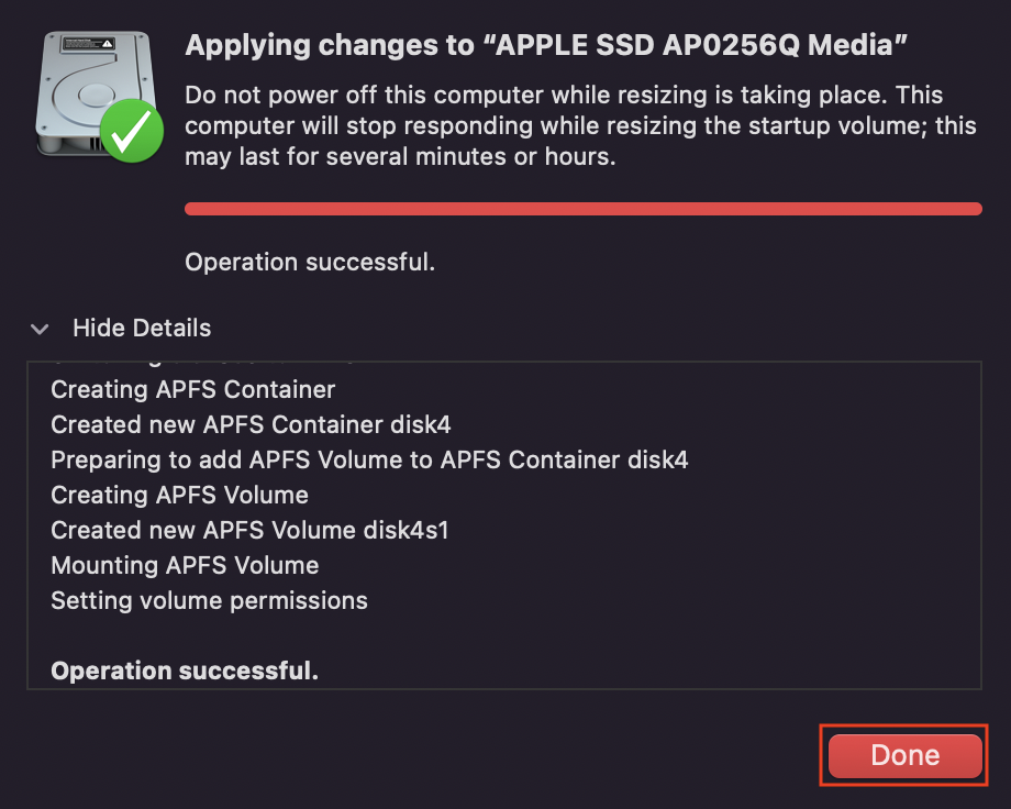 Após a partição ser concluído, clique em Concluído para finalizar o processo.