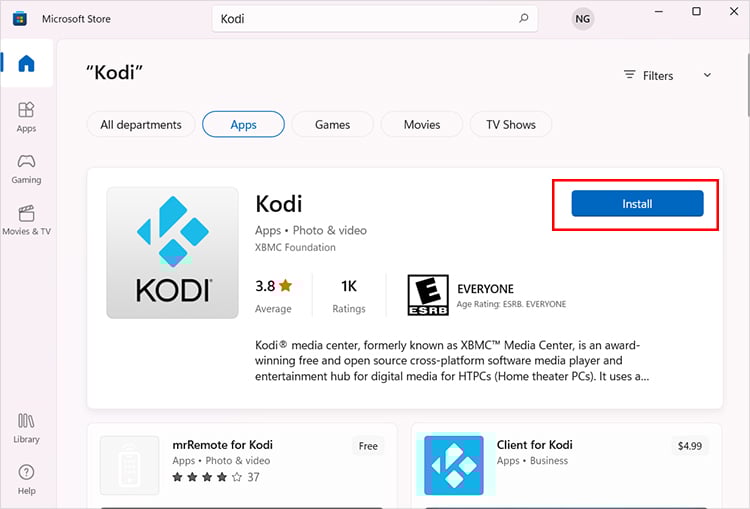 Na barra de pesquisa superior, digite Kodi e pressione Enter. Ao lado do Kodi, clique em Instalar botão.