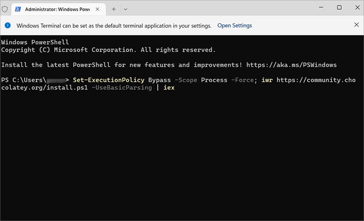 Digite a tecla Windows + tecla X Dependendo da versão do Windows, clique em Windows Powershell (Admin) ou Windows Terminal (Admin)Confirme para permitir Windows TerminalAgora, digite Set-ExecutionPolicy Bypass-Scope Process-Force; iwr https://community.chocolatey.org/install.ps1-UseBasicParsing | iex e pressione Enter