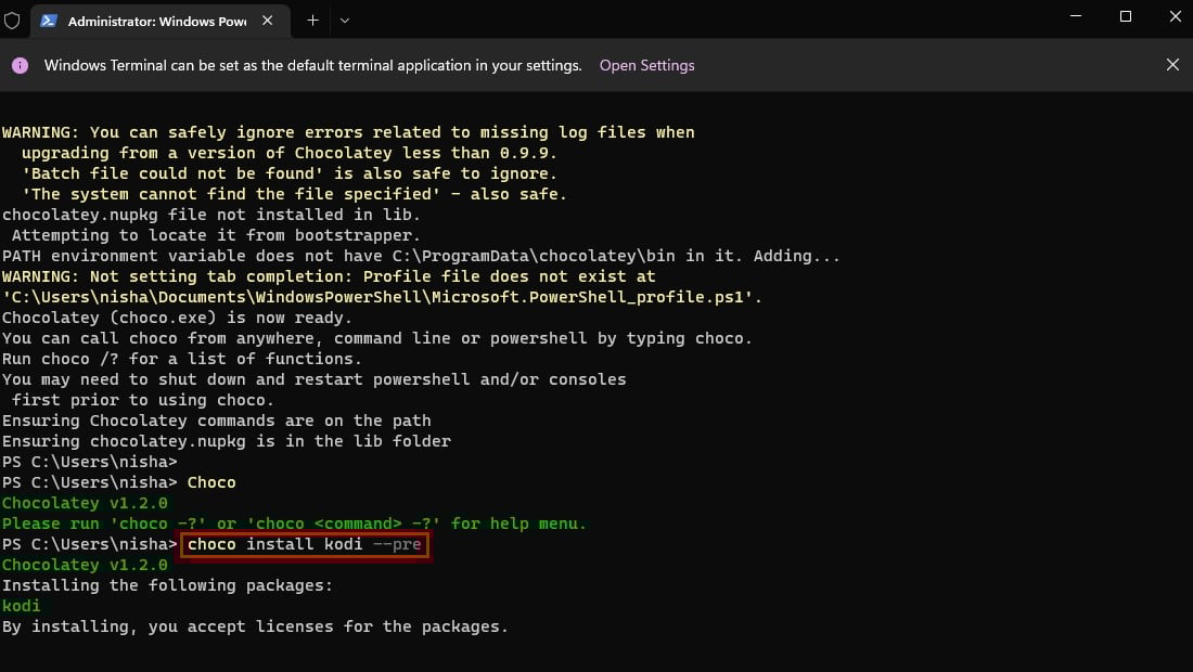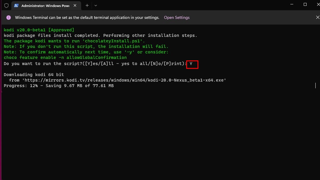 Novamente, digite choco install kodi – pré para instalar o Kodi.