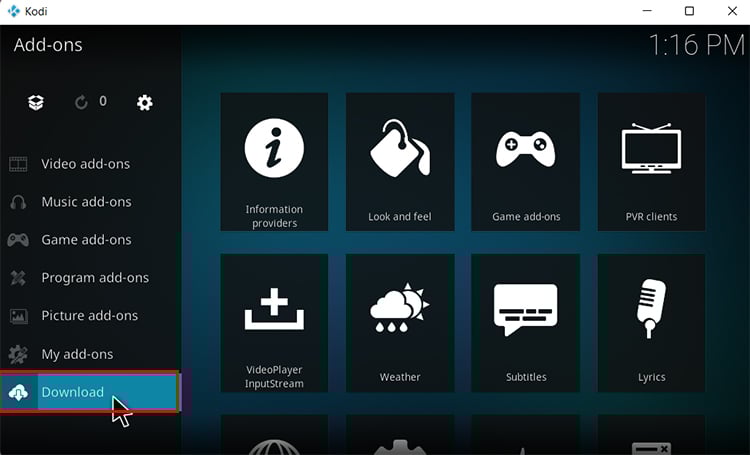 Inicie o aplicativo Kodi.Na tela inicial, escolha o Add-ons menu. Agora, clique na opção Download no painel esquerdo.