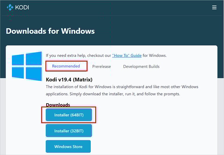 Caso não consiga baixar o Kodi no Windows na Microsoft Store, você pode instalar a versão.exe no site oficial. Depois de instalar o arquivo exe, você deve configurar o Kodi manualmente para deixá-lo pronto para uso. Recomendamos que você use esse método se quiser evitar atualizações automáticas em seu aplicativo. A Kodi lança várias versões, como Recomendado, Pré-lançamento ou Compilações de Desenvolvimento.