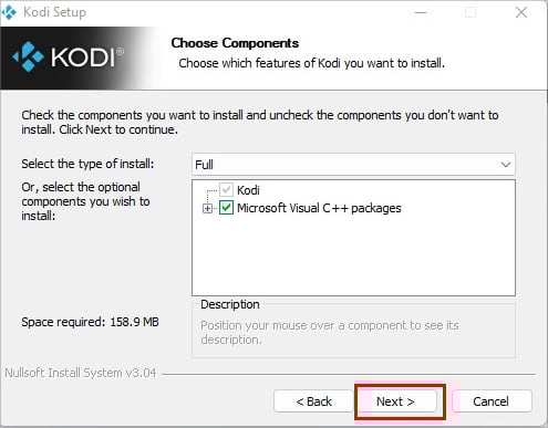 Agora, você deve selecionar os componentes Kodi necessários para instalar. Depois de escolher, clique em Avançar.