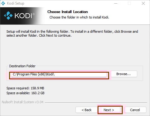 Selecione o local de instalação na caixa Pasta de destino. Escolha Avançar.