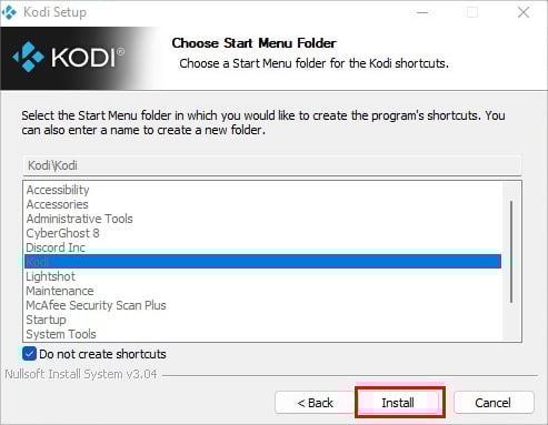 Você pode optar por criar um atalho de programa. Clique na Pasta nas listas. No entanto, se desejar pular, marque a caixa Não criar menu de atalhos. Em seguida, clique no botão Instalar .