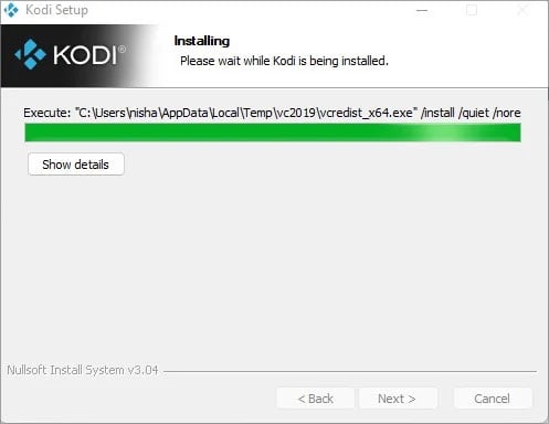 Seu Kodi começará a instalação. Durante o processo, não desligue seu PC ou feche a caixa de instalação.