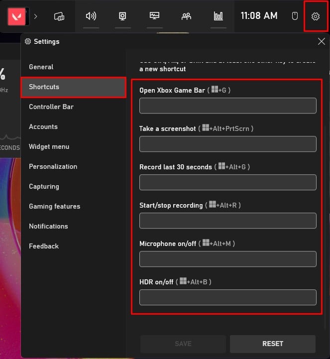 Abra a Barra de jogos XBOX.Clique no ícone de engrenagem no lado direito da barra de jogos. Selecione Atalho.À direita painel, em Teclado, defina a tecla de atalho desejada.