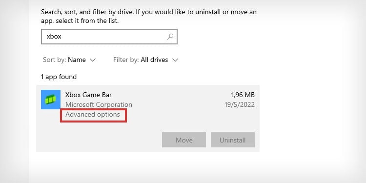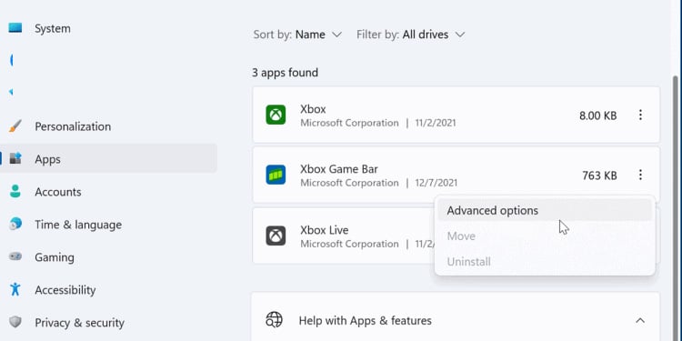 Localizar Barra de jogos do Xbox na lista. Clique nos três pontos e selecione Opções avançadas.